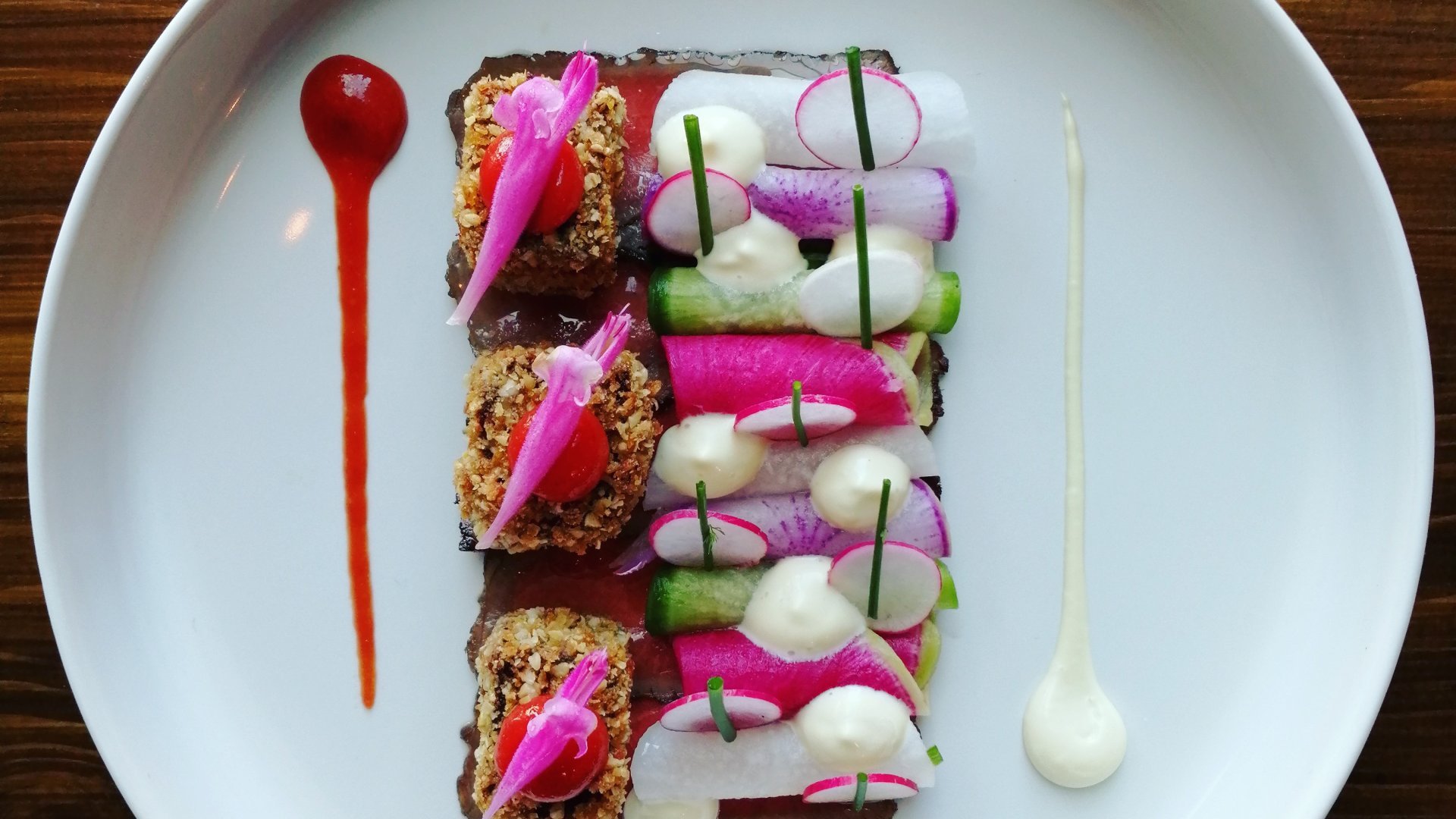 Les préparations classiques se marient avec les plus audacieuses, le cru rencontre le cuit, la terre séduit la mer, le beurre fond dans l’huile d’olive... il en ressort alors un plat "rassurant et malicieux", où les gourmets retrouveront deux émotions : le plaisir et la surprise.